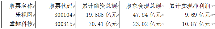 樂視網(wǎng)【融資+套現(xiàn)】金額為67.425億元,是上市以來累計(jì)實(shí)現(xiàn)凈利潤的6.95倍。掌趣科技【融資+套現(xiàn)】金額為93.43億元,是上市以來累計(jì)實(shí)現(xiàn)凈利潤的8.59倍。